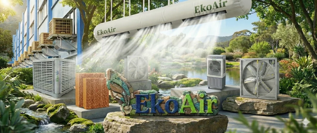 Ekoair evaporatif soğutucular, endüstriyel tesislerde %90’a varan verimle doğal soğutma sağlar. Düşük enerji tüketimi, yüksek hava kalitesi ve ekonomik çözümler. Fabrika, atölye, sera ve ticari alanlar için ideal.